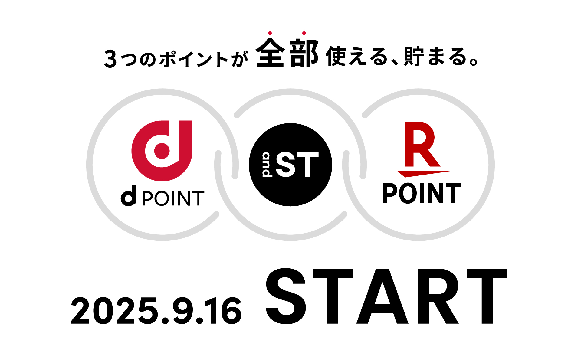 株式会社NTTドコモが提供するポイントサービス「dポイント」と楽天ペイメントが提供する共通ポイントサービスと連携し、業界初(※)のトリプルポイントが実現しました。これにより、当グループの展開する国内約1300店舗とand ST WEBストアにて、ポイントを使用する(使える、貯まる)ことが可能になりました。