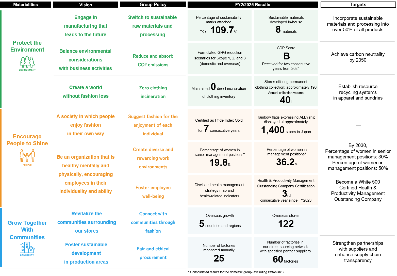 Our business is supported by many people, including customers and employees. The role we play is constantly changing due to the declining birthrate and aging population in Japan and the diversification of customer needs. We believe it is our responsibility to support all people to enjoy their lives and careers through fashion.