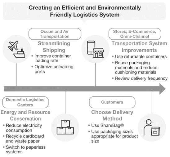 and ST HD strives to understand the CO2 emissions in our logistic activities. To this end, we identify the adverse environmental impacts on our business processes and implement appropriate reduction measures. Our distribution centers conserve resources by eliminating the use of delivery slips and receipts previously included with product shipments and using cardboard boxes that better match product sizes. We also reduce CO2 emissions by aiming to improve transportation efficiency through implementing comprehensive improvements. These efforts include improving delivery frequency and loading rates, as well as creating a joint delivery system.