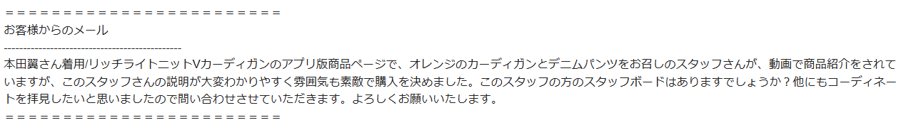 WEB担当はお客さまと直接触れ合う機会はなかなかないと思われがち。でも、WEBならではなお客さまとの接点もたくさんあるなと思います。以前、アンドエスティでグローバルワークの商品の接客動画をアップしたときに「このスタッフさんの提案がすごく良かったので、STAFF BOARDのアカウントを教えてください!」と、嬉しい声が届きました。他にも、WEBサイトへのお問い合わせに対応した際に感謝の言葉をいただくなど、関わり方は違っても、店舗で接客していた頃と変わらないやりがいを感じられています。