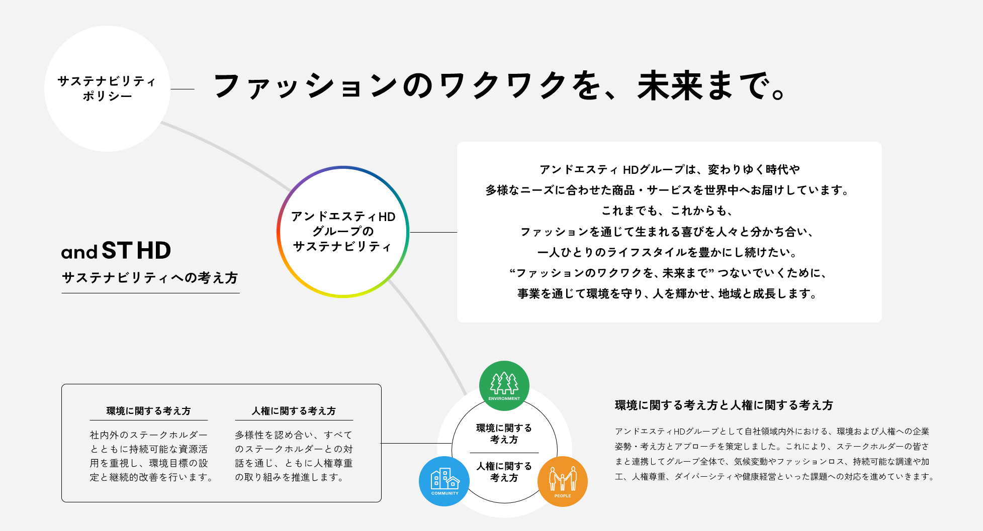 ファッションのワクワクを、未来まで。 サステナビリティへの考え方 [227KB] 環境に関する考え方 [710KB] 人権に関する考え方 [642KB] 役員メッセージ 重点テーマ ニュース コーポレートガバナンス ライブラリー ステークホルダーエンゲージメント