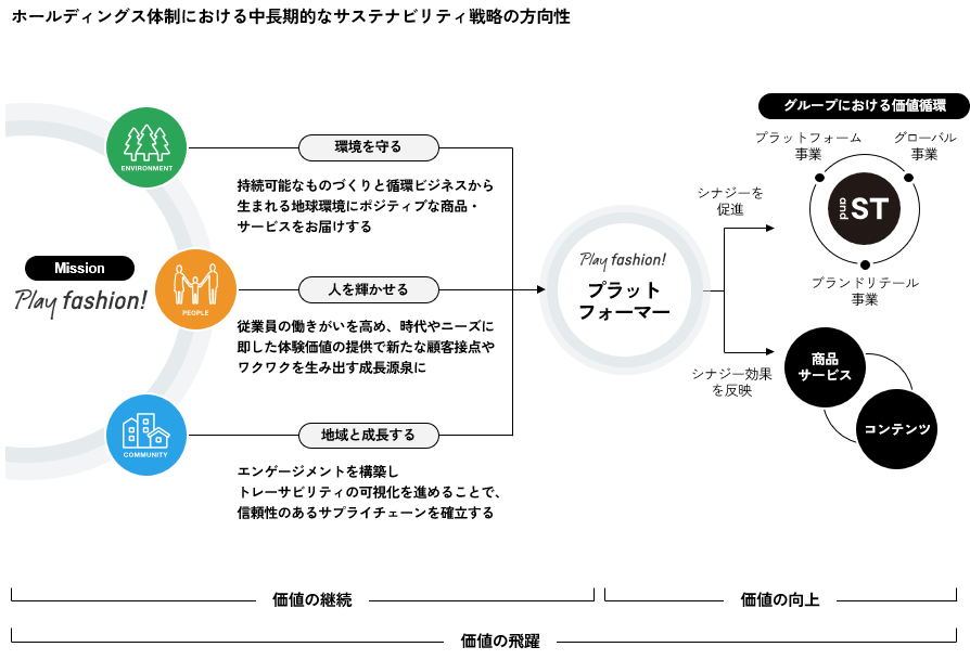 アンドエスティHDグループでは、サステナビリティポリシーに「ファッションのワクワクを、未来まで。」を掲げています。このポリシーのもと、サステナビリティへの取り組みを重要な経営課題と位置付け、サステナビリティを重視した経営を行います。私たちは事業活動を通じ、地球規模の課題解決に挑み、持続可能な社会と経済成長の実現に寄与していきます。その一環として、当社グループでは2023年3月1日付で取締役会での非財務領域での戦略推進をより一層強化することを目的に、サステナビリティ委員会を新たに設置しました。当委員会では中期経営計画および事業方針の基軸に関するマテリアリティの特定、適切な情報開示を中心に進めることで、ステークホルダーからの信頼と期待に誠実に対応していきます。また、当委員会では、気候変動をはじめとする当社グループのサステナビリティ方針や中長期の目標策定、特定したマテリアリティに対する進捗管理を行っており、取締役会または執行会議へ報告・提言を行うことで、グループにおける推進体制をさらに強化し、持続的に企業価値を高めてまいります。