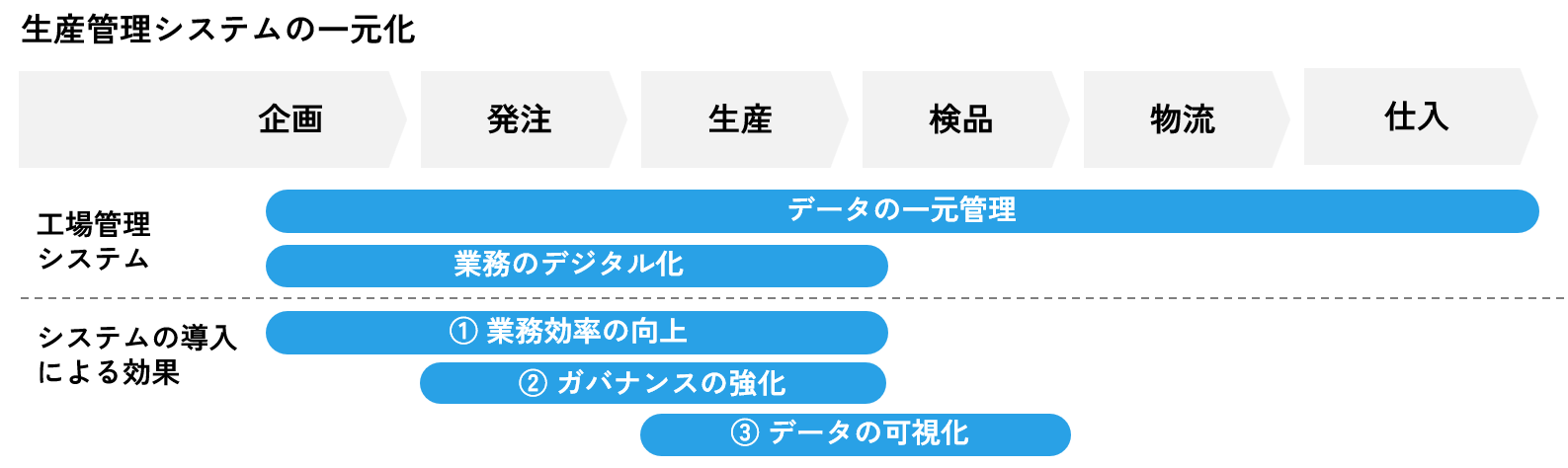 当社では、工場への商品発注や生産管理データの一元化を目的に、新たな工場管理システムを導入しています。従来までは各サプライチェーンの進捗や工場の状況は個別に管理されていましたが、このシステムの導入により「発注・生産管理業務のデジタル化」と「バリューチェーンでの生産企画から仕入計上までの一元管理とシステム連携」が可能となり、社内外関係者の業務効率が向上するとともに、ヒューマンエラーの防止とガバナンスの強化も図ることができます。