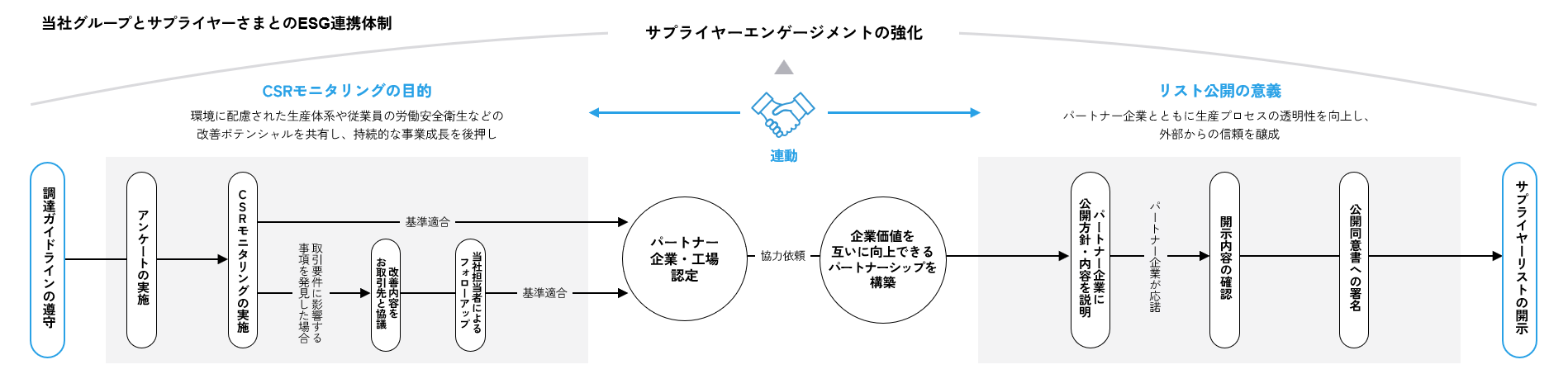 当社グループ独自の調達方針・調達ガイドラインを策定し、CSRモニタリングを通じてサプライヤーさまとのエンゲージメント強化に取り組んでいます。CSRモニタリングでは生産部社員が工場に赴き、方針や生産現場の労働環境・衛生環境などを確認するとともに、対話の場を設けています。品質向上や環境負荷低減を目指した生産方法、従業員の心身の健康の維持・向上につながる働き方などの課題を共有し、サプライヤーと改善に向けて協働しています。