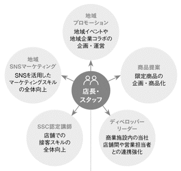 店舗で働く従業員がキャリアを自分で考え、挑戦できる機会を生み出すキャリア拡大支援プロジェクト「キャリカク」を2022年9月より実施しています。「店舗にいながら関心分野にもっと積極的に関わりたい」「自身の個性や強みを活かしたキャリアを形成したい」「販売に付随する分野でさらにステップアップしたい」といった店舗従業員の声を拾い実現しました。地域に根差し地域活性化イベントや地域企業コラボを企画・運営する「地域プロモーション」、販売スペシャリストとして店舗の接客スキル向上を担う「SSC*認定講師」など、大きく5つの役割を新たなキャリアステップとして設定しています。常にお客さまの声やニーズ、地域特性を汲み取り店舗で活躍する従業員は当社の成長を支える原動力です。自分のキャリアを自分で描き、いつまでも働く“ワクワク”を持ち続けられるよう支援していきます。